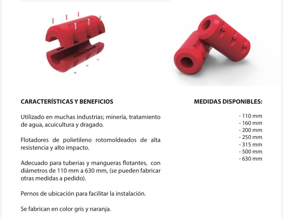 Nuestros Flotadores para tubos son de polietileno rotomoldeados en color naranja y gris, colores visibles a distancia, firmes y robustos.
